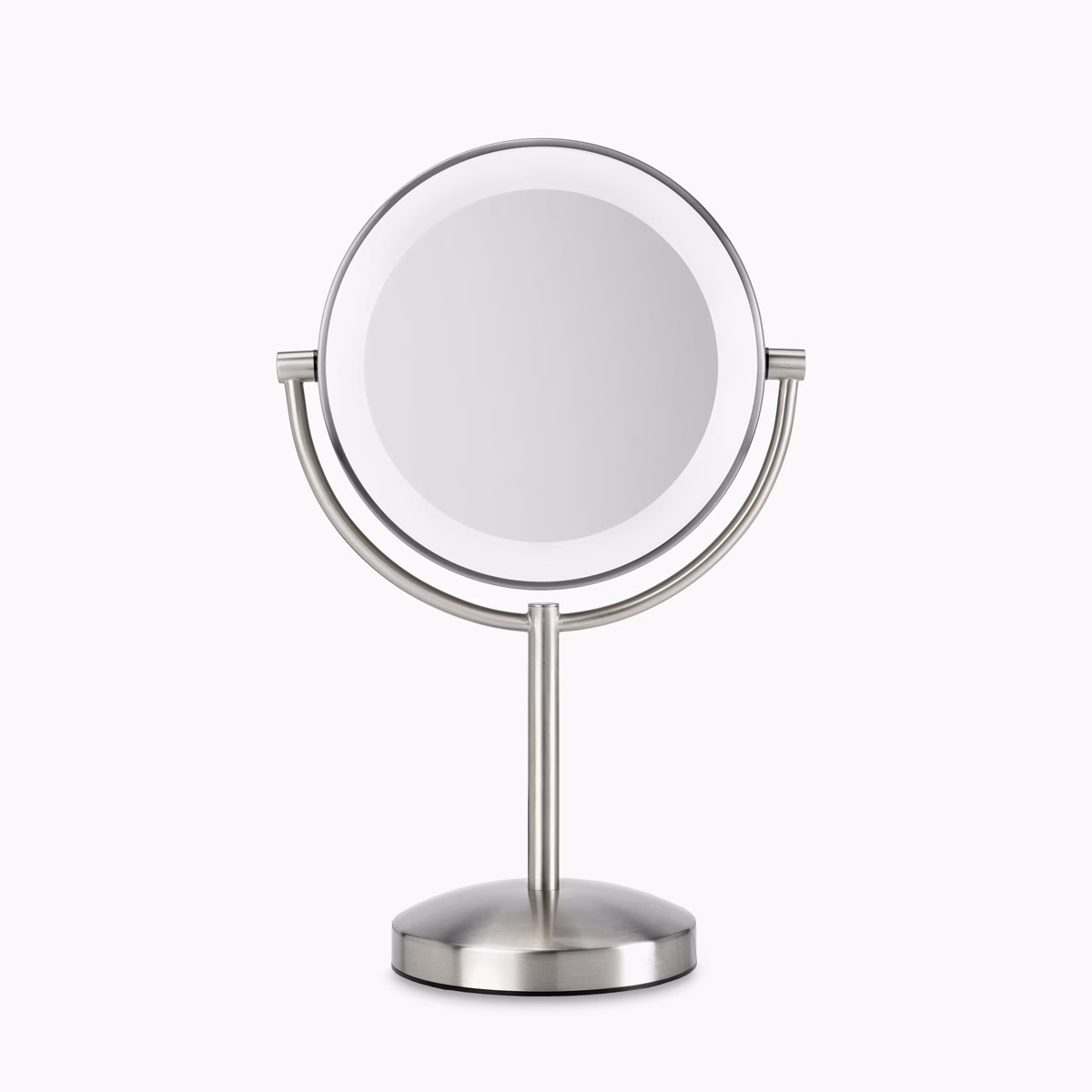 Ümmargune LED valgustusega meigipeegel. 1 valguse seadistus. Valgustab suurepäraselt nägu ja kaela. Läbimõõt 21,5 cm. Üks pool peeglist on 1x suurendusega ja teine pool 8x suurendusega. Pöörlev raam võimaldab kallutada peeglit vastavalt soovile. Harjatud metallist viimistlus. Töötab vooluvõrgust